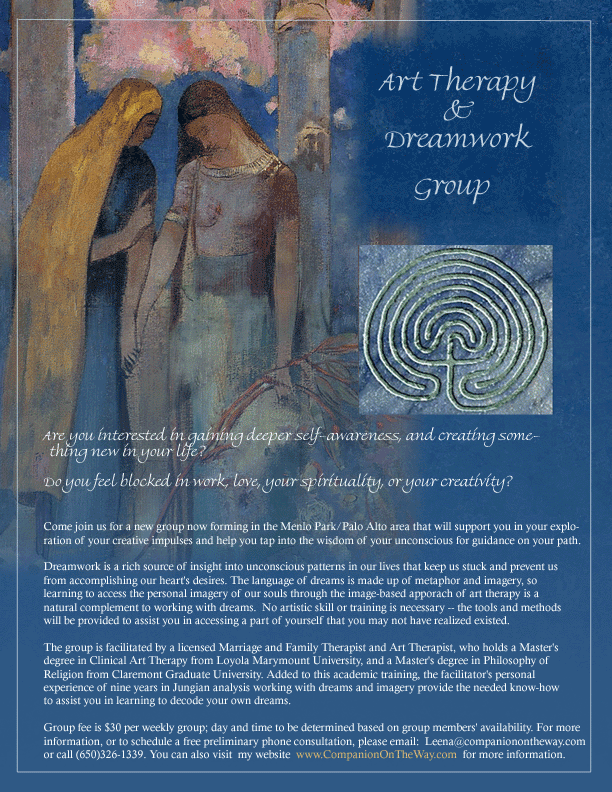 In this group we will be using drawing, painting, collage making, reflective writing and poetry to give form to the images stirring within us. These images from our unconsious can serve as an inner compass pointing the way past obstacles to our goals and dreams. Our rational, linear, verbal "left brain" approach to problem-solving often fails us when we find ourselves at our "growing edge," where the challenges of life have rendered our habitual ways of approaching things unworkable. Even if you don't consider yourself artistic or creative, there is a hidden wisdom waiting to be discovered in your soul, which you can learn to access and cultivate.